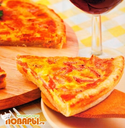 Ветчину нарезать тонкими ломтиками, слегка обжарить на сухой сковороде. Выложить на тесте ровным слоем.