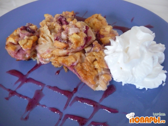 Вылить тесто на фрукты и запекать 30-40 мин, чтобы тесто схватилось и приобрело золотистый цвет.