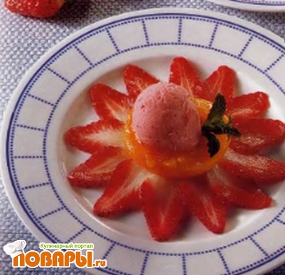 Непосредственно перед подачей выложите на каждую половинку персика шарик клубничного мороженого и украсьте листиками мяты.