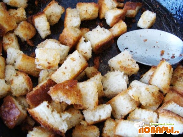 После того, как сухарики приобретут золотистый цвет добавить ложку сливочного масла, чтобы оно впиталось в сухарики.