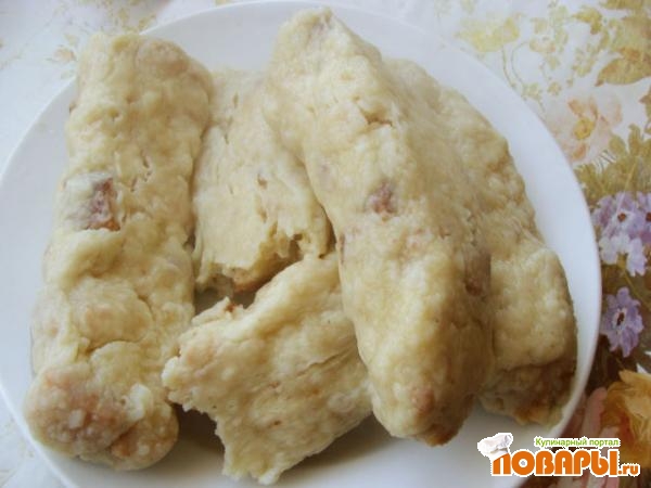 Замешиваем тесто. Яйцо взбиваем с солью,добавляем молоко, муку, соду и замешиваем тесто. Добавляем сухарики, домешиваем муки, столько чтобы оно могло отлипать от рук. Тесто делим на колбаски. В моем случае получилось четыре колбаски.