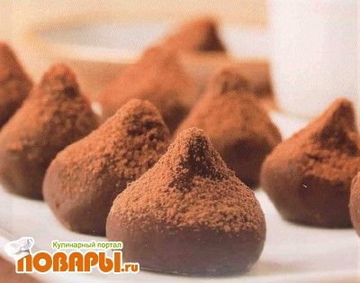 Шоколадную массу снимите с огня, при интенсивном помешивании введите яичный желток и кофе. Смесь слегка охладите, сформуйте из нее небольшие конусы и запанируйте их в какао. Трюфели охладите.