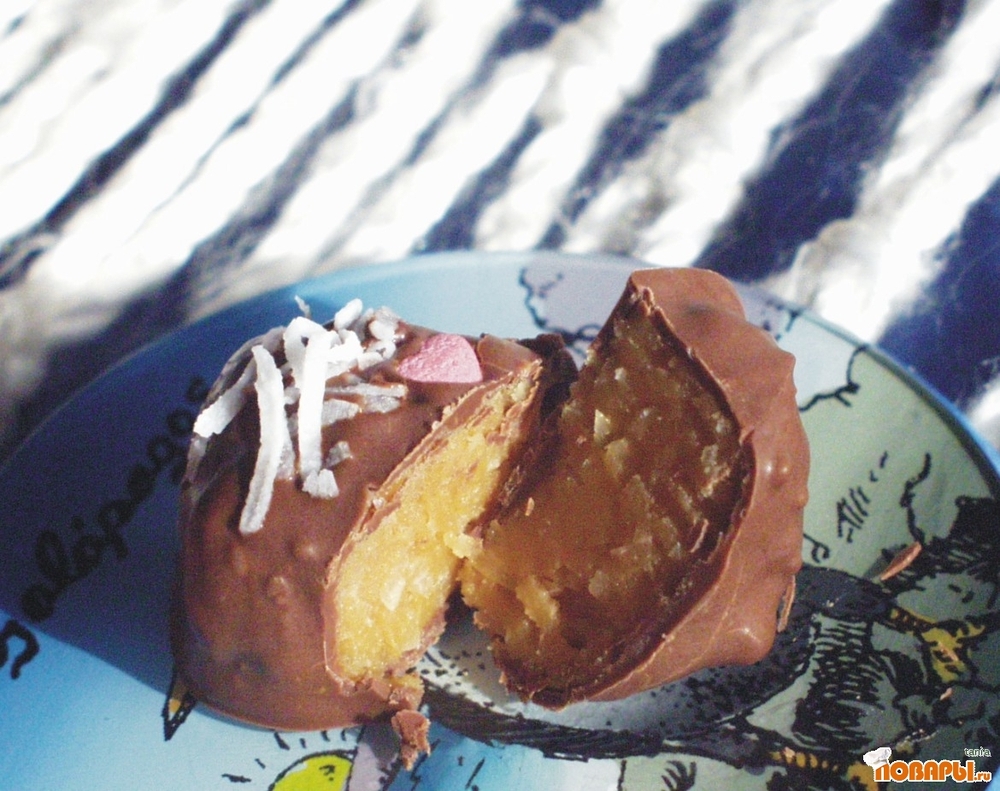 Снять бумагу. Нарезать прямоугольниками и обмакнуть каждую в шоколаде. Пока шоколад еще не застыл, украсить кокосовой стружкой или драже.