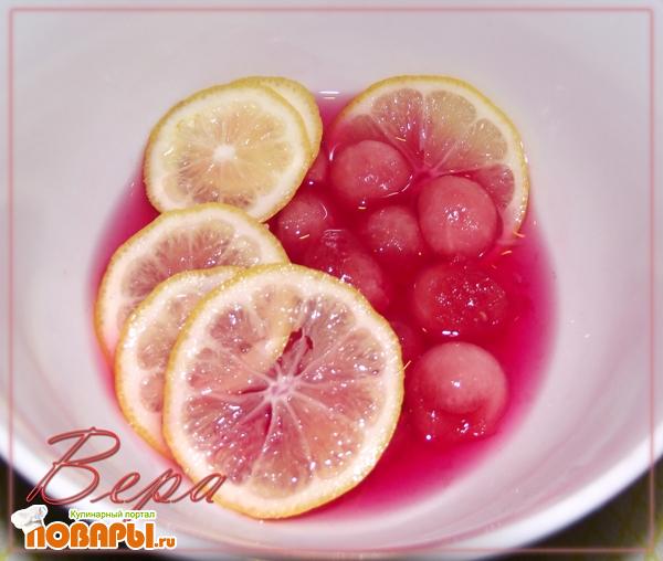 В глубокую посуду выложить арбуз и лимонные дольки,