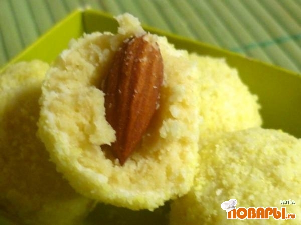 Из полученной массы выделать шарики размером с орешек, вдавить в каждый по миндалине, придать круглую форму. В блендере перемолоть желтую кокосовую стружку в порошок. Поместить ее в глубокую тарелку.