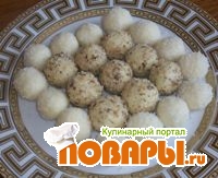 ЛЕПИМ КОНФЕТЫ: Ложкой взять небольшое количество массы, в середину положить миндаль, либо чернослив (лучше "На зубок" - он сочный и мягкий), скатать в ладонях в шарик размером как покупные конфеты "Рафаэло", затем обвалять в кокосовой стружке, либо тёртом грецком орехе.