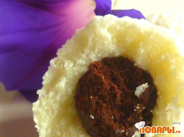 Вынуть кокосовую массу из холодильника, брать немного массы, делать лепешечку, обволокнуть шоколадный шарик, сформировать шарик побольше, размером с грецкий орех. Когда все шарики будут готовы, спрятать их на пол часа в холодильник, они прилично затвердеют, тогда растопить остальной шоколад