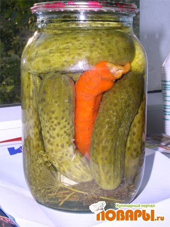 В 3х л. банку уложить огурцы со специями (укроп, чеснок, хрен, лист лавровый, листья смородины) и в каждый бутыль положить по 3 горьких перца.