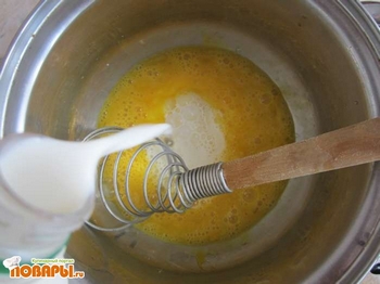 Делаем тесто для блинчиков. Для этого в взбитые яйца добавляем щепотку соли, молоко и все тщательно перемешиваем.