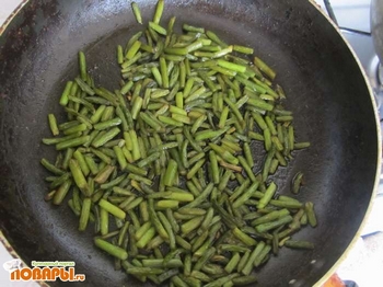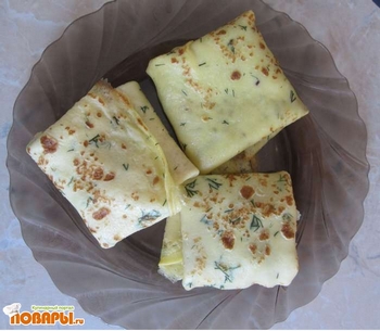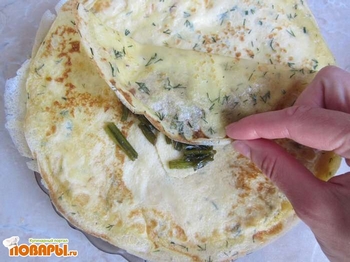 Отдельно жарим блинчики из готового теста. Когда блинчики остынут, на середину выкладываем поджаренные стрелки.