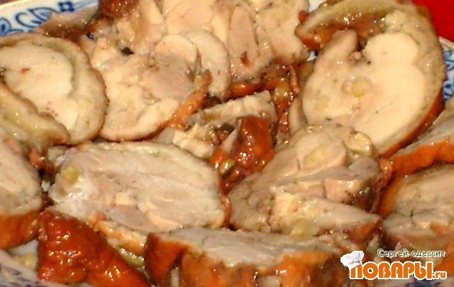 В кастрюле был почти что куриный холодец. Достал куриные «колбаски». При нагревании до комнатной температуры жидкость с них стекла. Натер измельченным чесноком, в лоток и на ночь поставил для пропитки в холодильник. Перед подачей на стол нарезал кружочками.