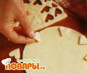 Замотайте тесто в целлофановую пленку и поставьте в холодильник на 1 час. Затем раскатайте тесто скалкой и с помощью блюдца и ножика вырежьте 6 кругов диаметром 15 см. Перемесите обрезки теста, вновь раскатайте и вырежьте сердечки, которые прикрепите по краю кругов из теста.
