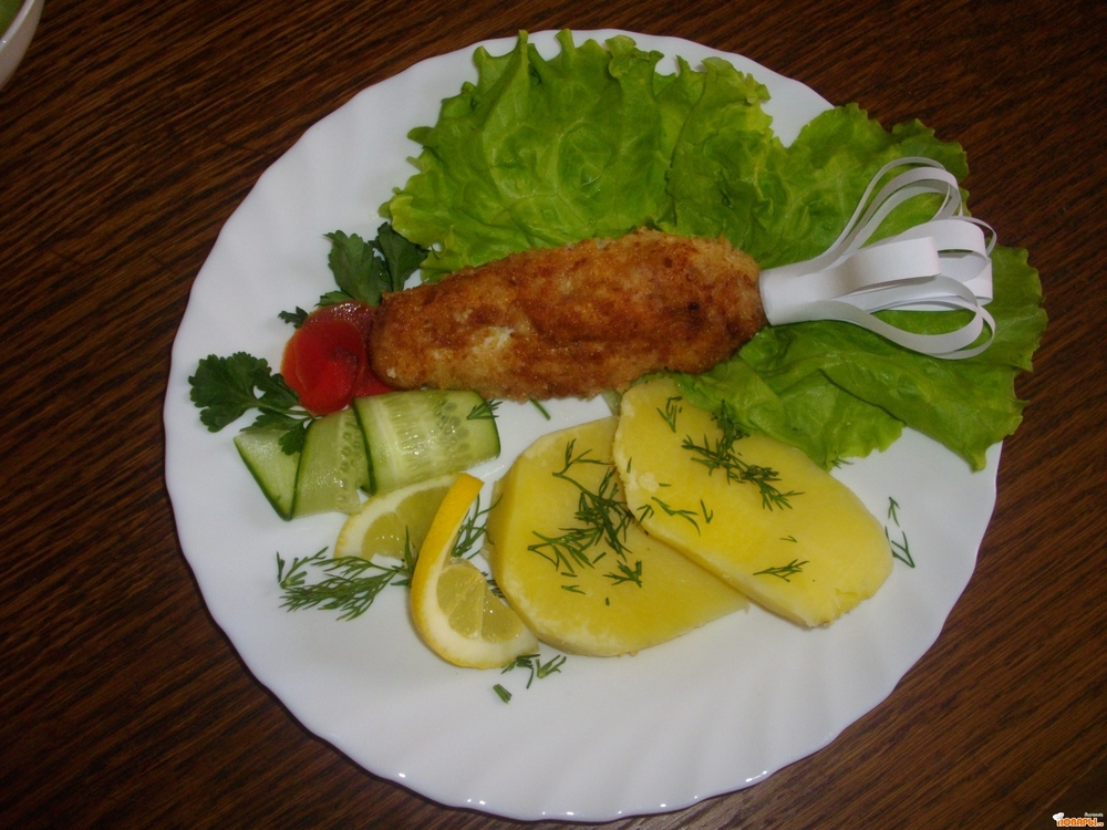 В классическую "Киевскую" заворачивают с одного конца куриную косточку, другой кончик торчит наружу - на него при подаче надевается бумажная папильотка.
