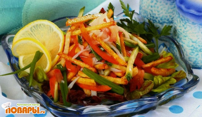 Картофель нашинковать тонкой соломкой и обжарить на растительном масле, выложить на салфетку, чтобы впиталось масло. Огурцы, болгарский перец и помидоры нарезать соломкой, зеленый лук кусочками длиной 3-4 см. Крабовое мясо разделить на волокна.