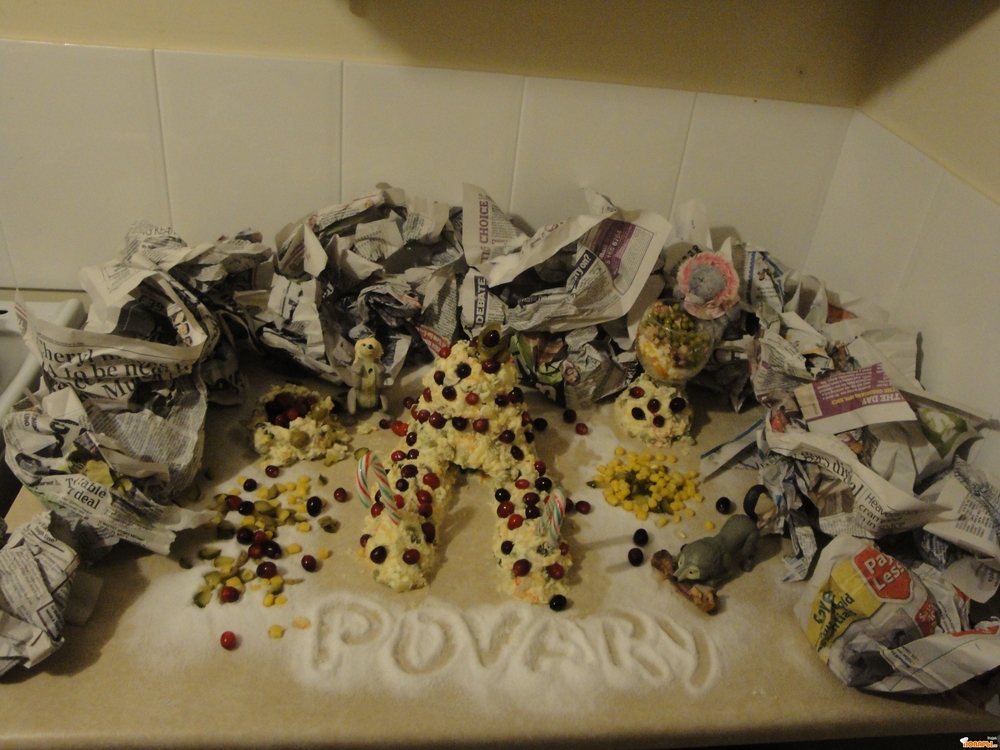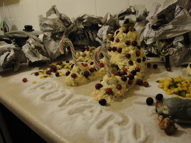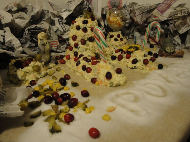 Для него мы строим кружок небольшой высоты и ложим в него брюкву. За колодцем спрятался шустрый волчонок, который сделал беспорядок вдоль замка. Для безпорядка ипользуем огурчики мелко нарезанные соломкой, как и оливки, кукурузу, наши бусинки из клюквы. Последний штрих - это, берем сахарную пудру и окуратно все засыпаем, - это снежок. И получается замок среди гор и скал, где живут волченки и мишутка и кто-то еще в самом замке!
