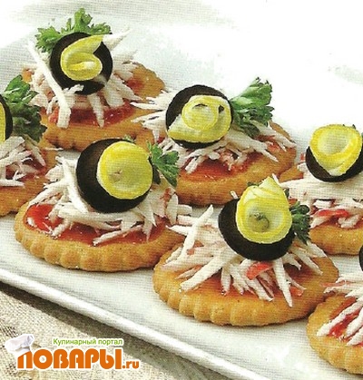 Смешайте майонез с соусами чили и табаско, смажьте смесью крекеры. Сверху на соус положите горкой крабовое мясо.