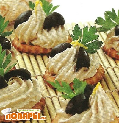 Оформите четвертинками маслин и листиками зелени.
