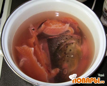 Заливаем рыбные кусочки подсоленной водой и варим на среднем огне в течение 15-20 минут, не забывая снимать пенку.