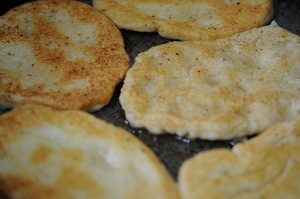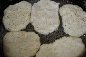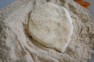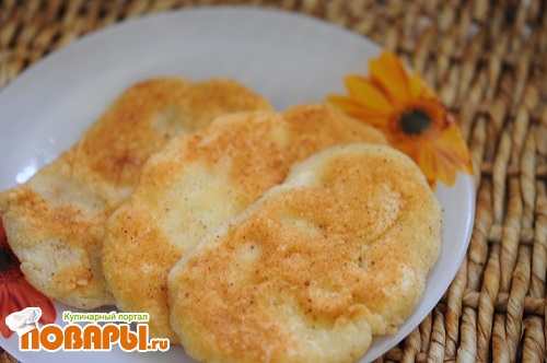Подготовим в отдельной тарелке панировочные сухари. Лепим из теста оладьи размером с ладонь, шириной приблизительно 1 см. Обволакиваем наши оладушки с двух сторон в сухарях и выкладываем на обжарку.
