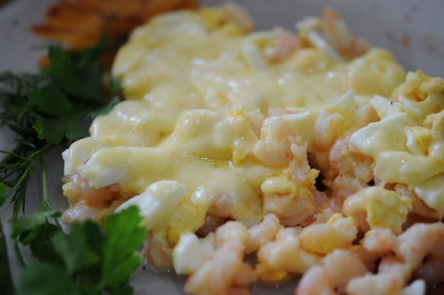 Яйца отвариваем заранее, очищаем их и мелко режим. Выкладываем порезанные яйца поверх креветок- не мешая. Яйца посыпаем горчичным порошком.