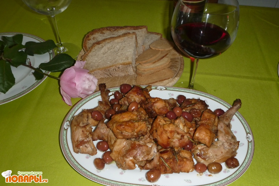 Режем на порции кролика. Разогреваем ол. масло с чесноком. Добавляем шалфей и розмарин. Как только почувствуете аромат трав, пара и кролику на сковороду. Поджариваем до легкого румянца. Добавляем стакан оливок и заливаем вином, накрываем крышкой (не плотно) готовим на среднем огне до испарения вина( около 15 минут), пришла очередь винного уксуса, выливаем, накрываем крышкой ( не плотно), готовим до выкипания, солим ( оливки соленые, поэтому солите меньше).