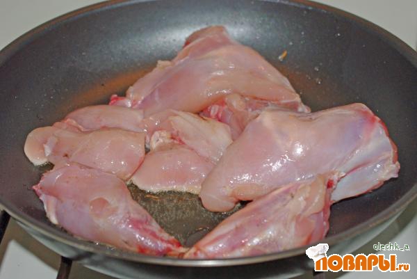 Убираем чеснок. Поджариваем немного кролика. У меня вот такой красавчик)