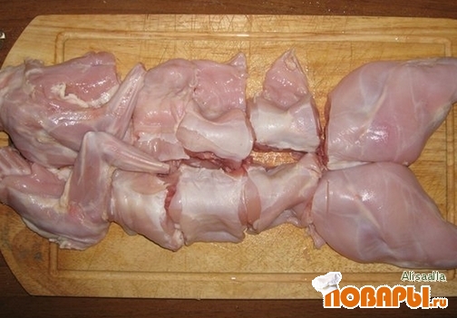 Тушку кролика разделить на порции и залить водой чуть подкисленной уксусом и оставить на несколько часов.