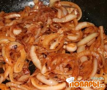 После вынимаем из воды, мясо посолить, обвалять в муке и обжарить на сковороде до образования корочки. В этом же масле обжарить репчатый лук до золотистого цвета.