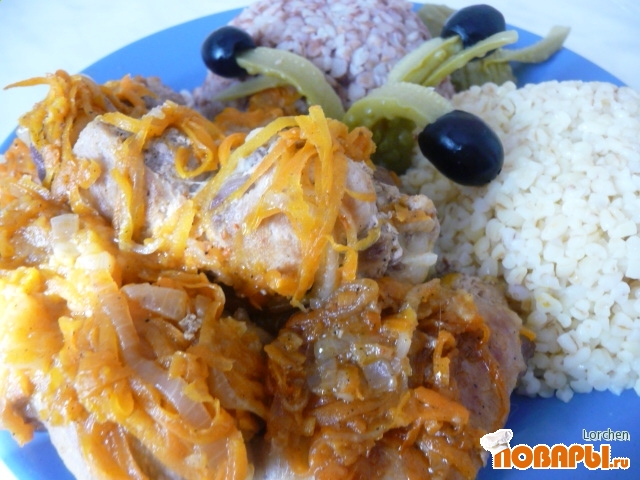 На гарнир у меня булгур и гречка да соленые огурчики.