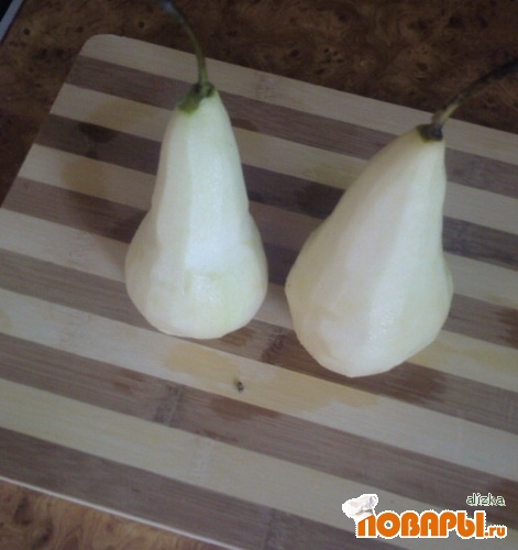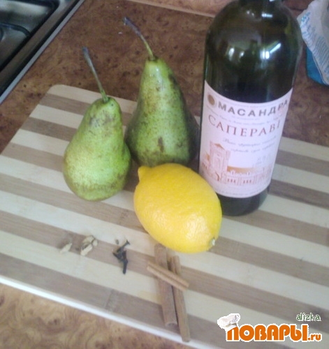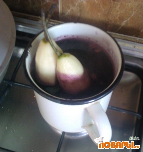 В кастрюльку налить вино, добавить пряности, сок половинки лимона и нагреть, но не доводить до кипения. Погрущить грушу в вино и подержать несколько минут на огне. Сныть с огня. Чем дольше груша будет стоять в вине, тем глубже она будет окрашиваться.