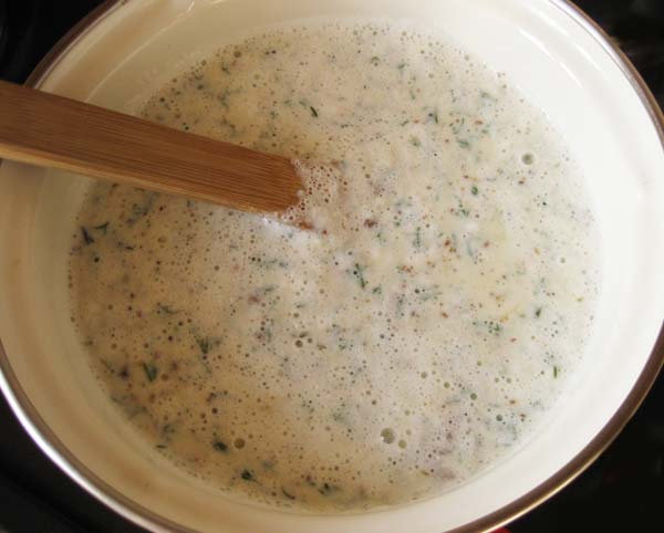 Продолжая мешать, ждем того момента, когда молоко и яйца свернутся и отделится полупрозрачная сыворотка.