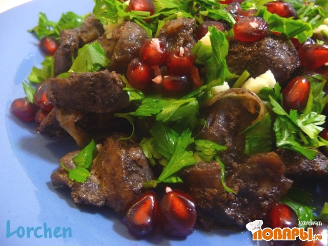 Выкладывает на тарелку, посыпаем мелко порезанными петрушкой, чесноком и зернами граната.