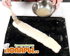 Уложить начинку на тесто, соединить края, выложить на противень швом вниз, смазать взбитым яйцом.