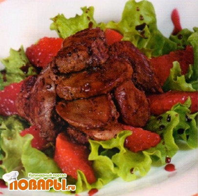 Разложить помытые и обсушенные листья салата на порционные тарелки, выложить на них печень, посолить и поперчить по вкусу. Полить тёплым винно-медовым соусом, гарнировать ломтиками грейпфрута и подавать.