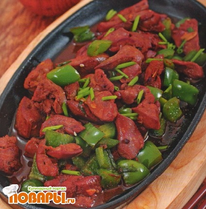 В сковороде разогреть растительное масло, обжарить печень в течение 3-4 минут до появления коричневого оттенка. Добавить сладкий перец, лук, чеснок и имбирь, обжаривать ещё 1-2 минуты.