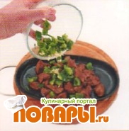 Добавить в сковороду перец чили, коричневый сахар и тёмный соевый соус, перемешать. Сбрызнуть блюдо кунжутным маслом и подавать горячим в сковороде, в которой оно готовилось.