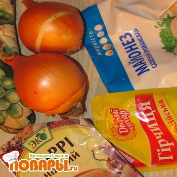 В крылья добавляем порезанный лук, майонез (на 1-1,2 кг крыльев примерно 200 гр майонеза), лучше если он будет средней жирности, чтобы блюдо получилось более сочное и не жирное. Дальше по вкусу: 1 чайную ложку горчицы, карри, паприку и черный перец.