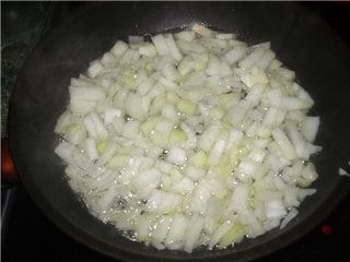 Лук режем и тушим в масле на небольшом огне.Добавить соль и специи.