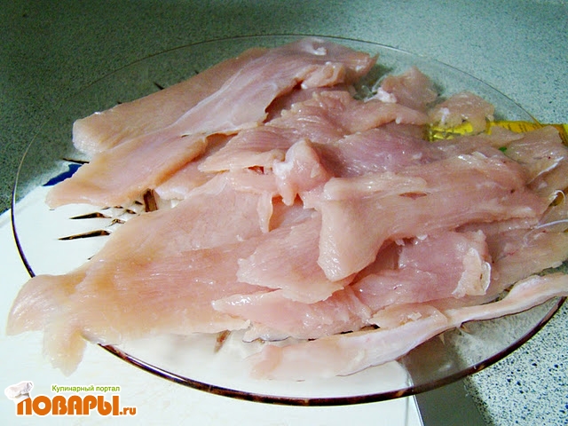 Куриную грудку без кожи и костей разрезать на кусочки толщиной не более 1 см, посолить и поперчить.