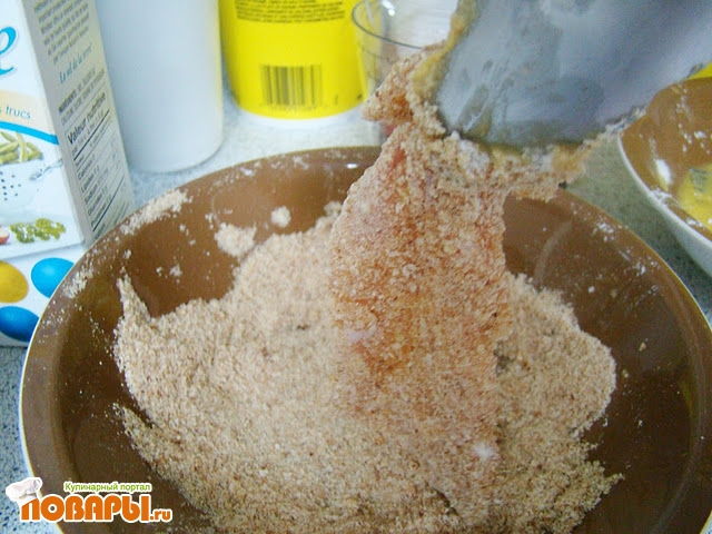 Кусочки обмакнуть в муке, затем взбить яйца в неглубокой тарелке, обмакнуть кусочки - удобно использовать специальные щипцы.
