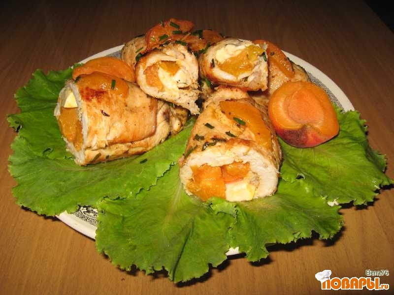 Мясные заготовки посолить, поперчить, присыпать специями и оставить на 20 минут. У абрикосов удалить косточки и нарезать тонкими дольками. Сыр натереть на терке. На каждый кусочек филе уложить ломтики абрикос, посыпать сыром, свернуть в рулет и закрепить зубочисткой.