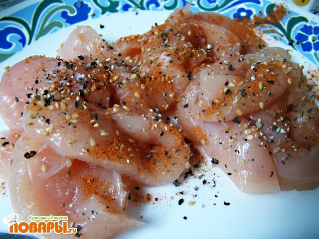 Промыть филе, обрезать лишний жир и слегка отбить. Разрезать вдоль, посолить и добавить приправы по вкусу.