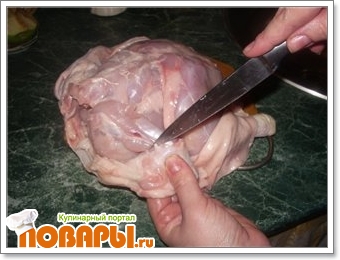 Тогда придется где то раздобыт кожу, чтобы все это не разваливалось :) или тщательно заматывать нитками,не пробовала чесно говоря:) мне легче с целой курицей такое проделать:)