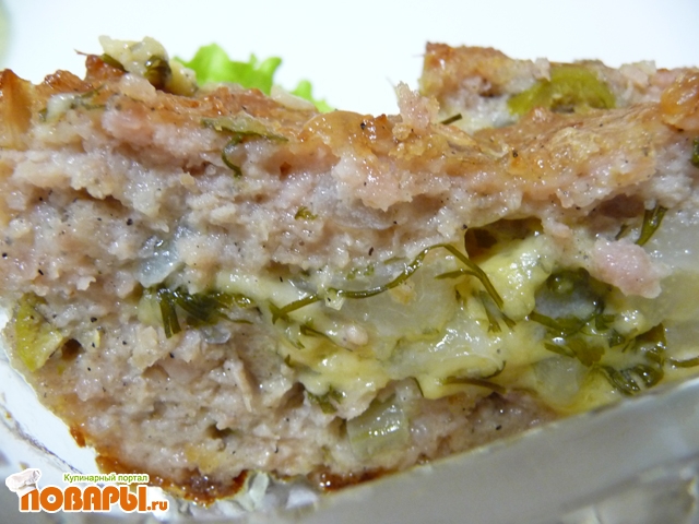 В форме для запекания выкладываем 3/4 частью фарша дно и бока. На фарш выложить начинку и накрыть оставшимся фаршем.