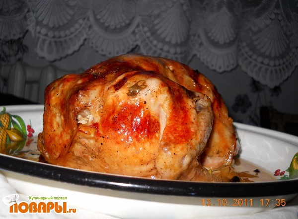 Чтобы курица получилась действительно гриль, её нужно поместить на решетку, а под неё подставить противень для сбора жира. Но можно поступить, как указано в четвертом пункте, но за 10 минут до готовности открыть курицу, чтобы получить румяную корочку.