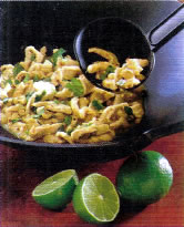 Разогрейте оставшуюся 1 ст. ложку масла в том же котелке на среднем огне. Добавьте полоски курицы и жарьте, время от времени помешивая, 5 минут, пока курица насквозь не потеряет розовый цвет. Выложите в чистую миску.