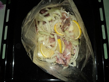 Лук почистить, порезать полукольцами и отправить в пакет. Лимон порезать полуколечками и тоже добавить в пакет.