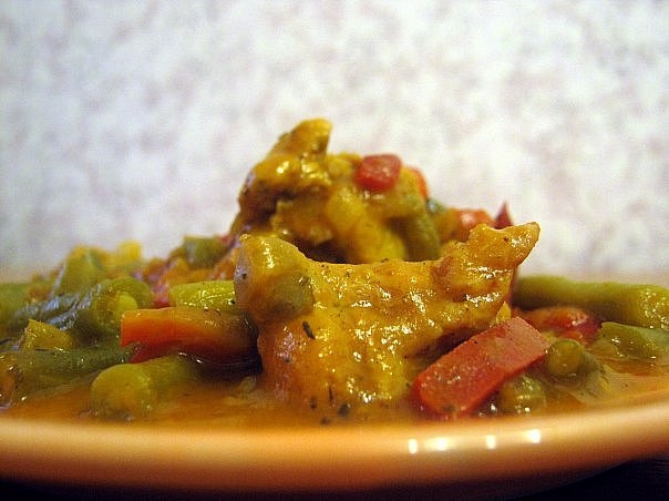 Затем выложить курицу на сковороду с растительным маслом и обжарить. Затем добавить маринованный лук, болгарский перец, стручковую фасоль, кетчуп, воды и потушить на медленном огне минут 25.