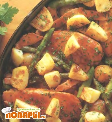 Лук обогащает вкус этого прекрасного рагу. Если под рукой нет мелкого лука-севка, то можно использовать луковицы среднего размера, разрезав их на четыре части. Грибы и спаржа удачно сочетаются с куриными грудками, сдобренными приправой, и постными полосками бекона.