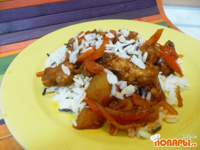 перед жаркой куриные кусочки можно просто обмакнуть в муку без крахмала,и еще советую томат пасту заменить на кетчуп(100-150 мл),только качественный кетчуп томатный или нежный,приятного аппетита)))))
